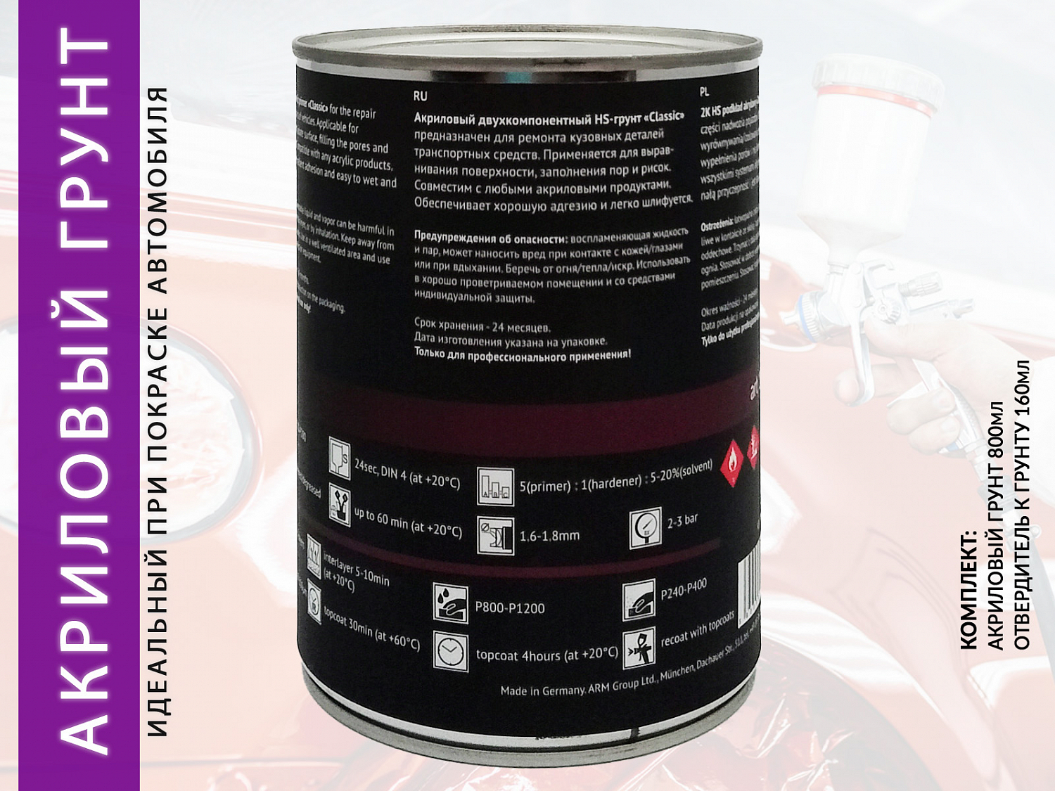 Акриловый двухкомпонентный HS-грунт «Classic» ARM (102-0803) предназначен для ремонта кузовных деталей транспортных средств. Применяется для выравнивания поверхности, заполнения пор и рисок. Совместим с любыми акриловыми продуктами. Обеспечивает хорошую адгезию и легко шлифуется. Короткое время сушки.