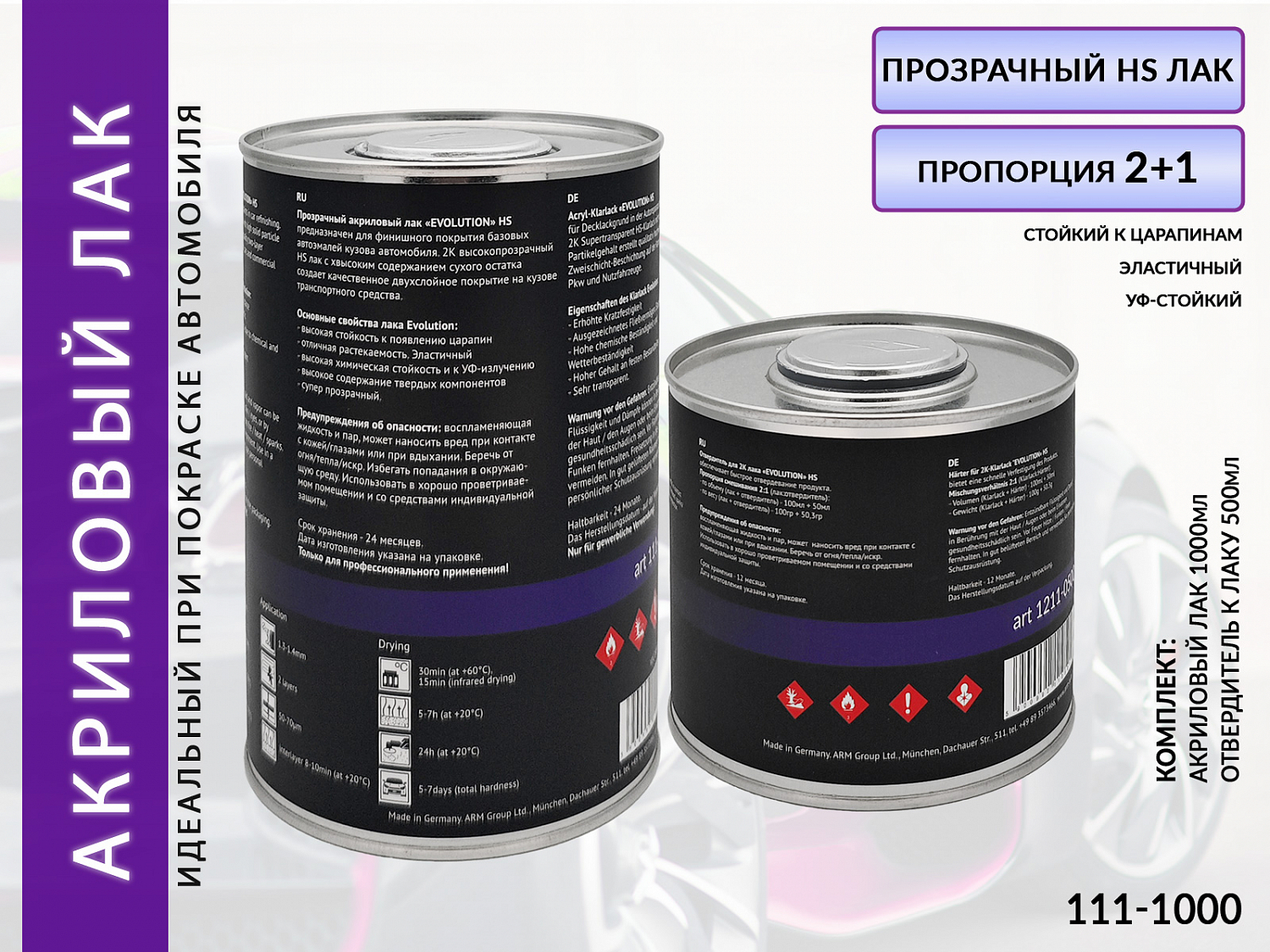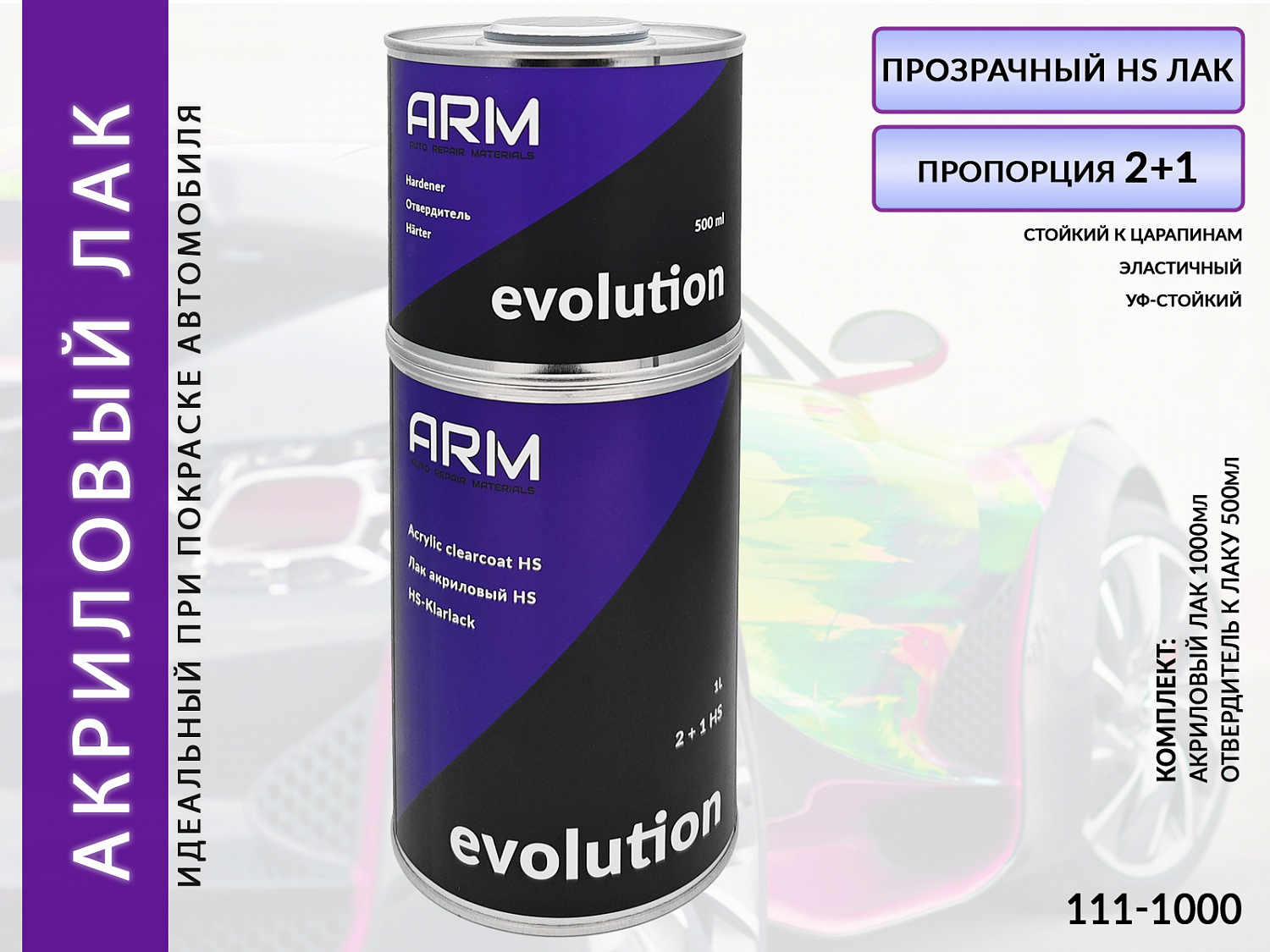 Прозрачный акриловый лак «EVOLUTION» HS ARM (111-1000) предназначен для финишного покрытия базовых автоэмалей кузова автомобиля. Двухкомпонентный бесцветный HS-лак с высоким содержанием сухого остатка создает качественное двухслойное покрытие на кузове легкового и коммерческого транспорта. Лак обладает великолепным блеском!