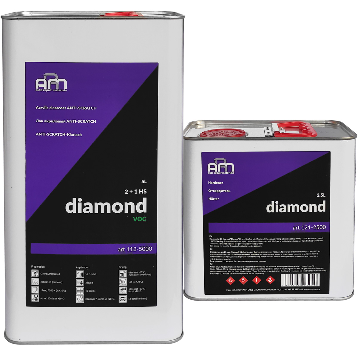 Прозрачный акриловый лак объемом 5л «DIAMOND» HS ARM (112-5000) предназначен для финишного покрытия базовых автоэмалей кузова автомобиля и спецтехники. Двухкомпонентный бесцветный ANTI-SCRATCH лак создает качественное двухслойное покрытие на кузове легкового и коммерческого транспорта. Лак поставляется в комплекте с отвердителем 2,5л.