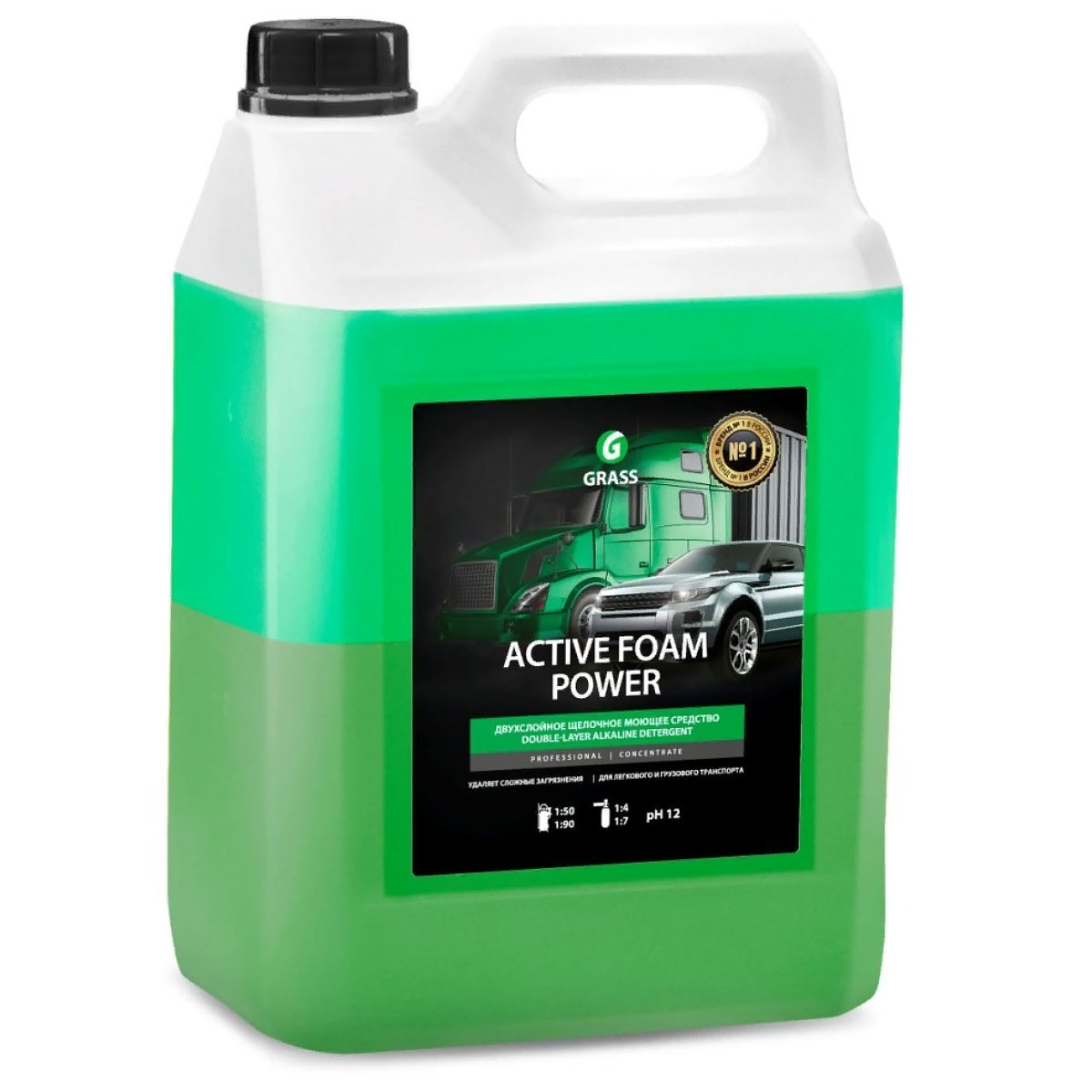 Автошампунь для бесконтактной мойки "Active Foam Power" GRASS 113140 - концентрированное двухслойное щелочное моющее средство для бесконтактной мойки легкового и грузового транспорта. Эффективно удаляет дорожную грязь, пыль, масло, следы от насекомых. Легко смывается.