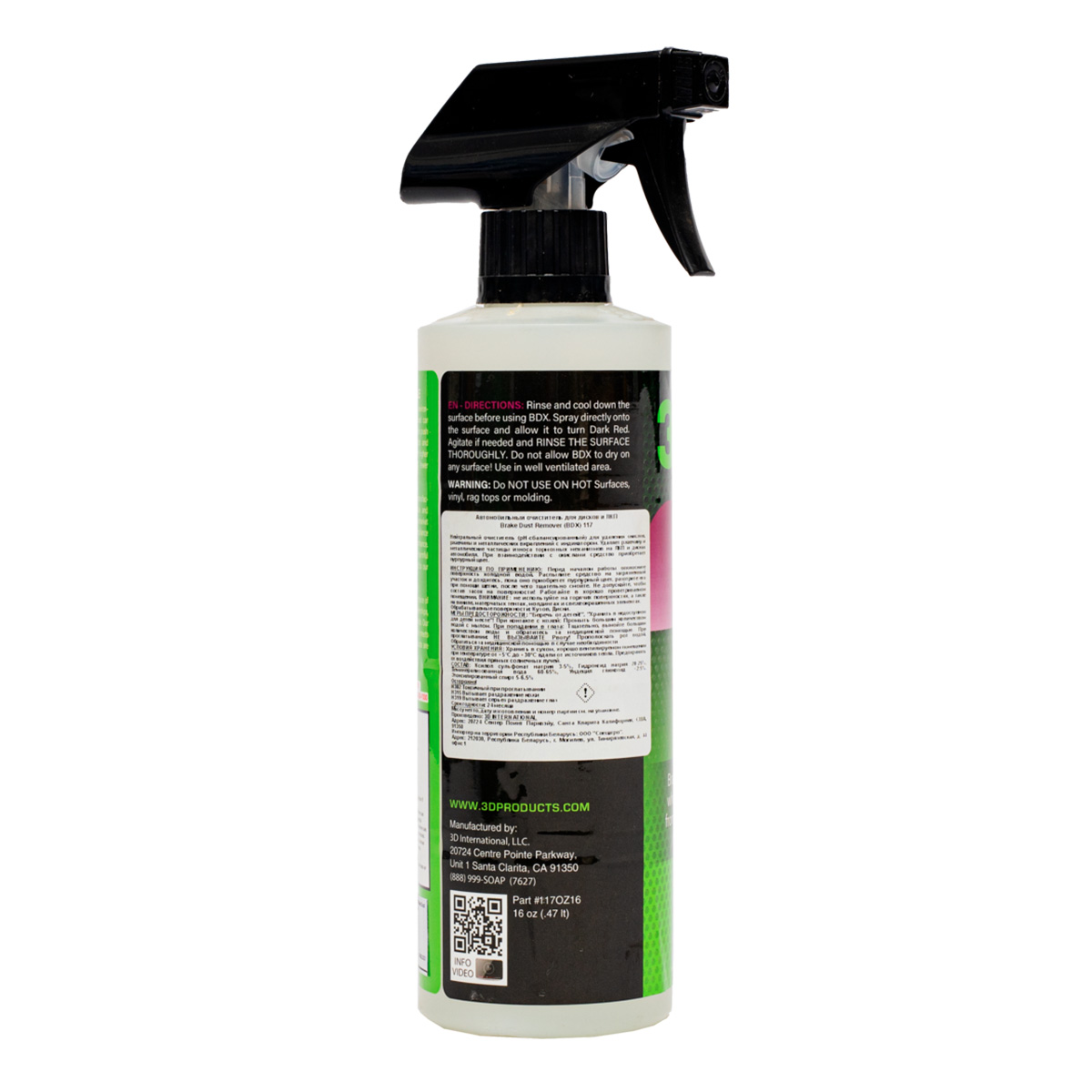 Очиститель металлических вкраплений 117 BDX от 3D Car Care – нейтральный очиститель металлических вкраплений, тормозной пыли и ржавчины с деталей кузова автомобиля, специально разработанное для удаления тормозной пыли, окисления железа и отложений с автомобильных колес и ЛКМ. Инновационная формула, изменяющая цвет, наглядно демонстрирует свою эффективность – она приобретает фиолетовый оттенок, поскольку активно устраняет окись железа и отложения загрязнений. Устраняя даже самые глубокие загрязнения, BDX не только очищает, но и помогает защитить ваши поверхности на длительный период, обеспечивая стойкое безупречное покрытие.