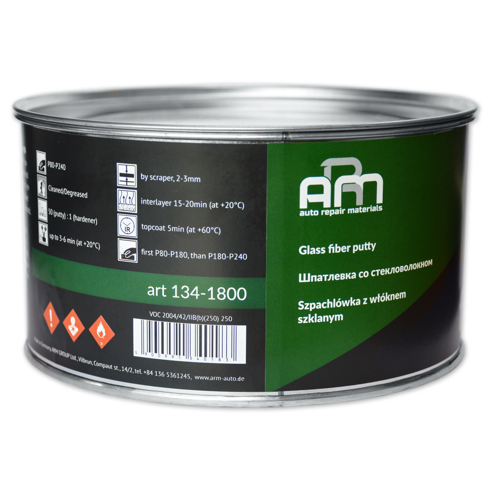 Шпатлевка FBR-GLASS ARM (134-1800), усиленная стекловолокном предназначена для выравнивания и усиления жесткости поверхностей при кузовном ремонте транспортных средств или любых других металлических элементов. Подходит для любой стали (черный и оцинкованный металл, алюминий) и пластиковых элементов (пластик, карбон, стеклопластик). Высококачественная эластичная полиэфирная шпатлевка, армированная стекловолокном повышает механическую прочность отремонтированного элемента. Благодаря большому количеству длинных волокон, шпатлевка имеет очень высокую механическую прочность и хорошую эластичность. Не рекомендуется использовать эту шпатлевку для больших площадей.