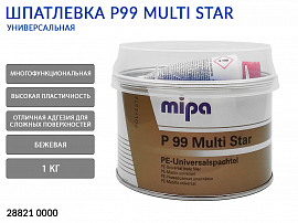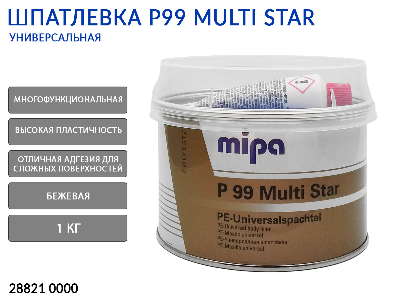Многофункциональная шпатлевка P-99 Multi-Star MIPA (28821 0000) — двухкомпонентная полиэфирная шпатлевка, рекомендуется как основная шпатлевка при необходимости восстановления стальных, оцинкованных покрытий и стекловолокна. Благодаря тонкой и однородной структуре, применяется на всех этапах подготовки и при салонных работ, как наполнительная и финишная.