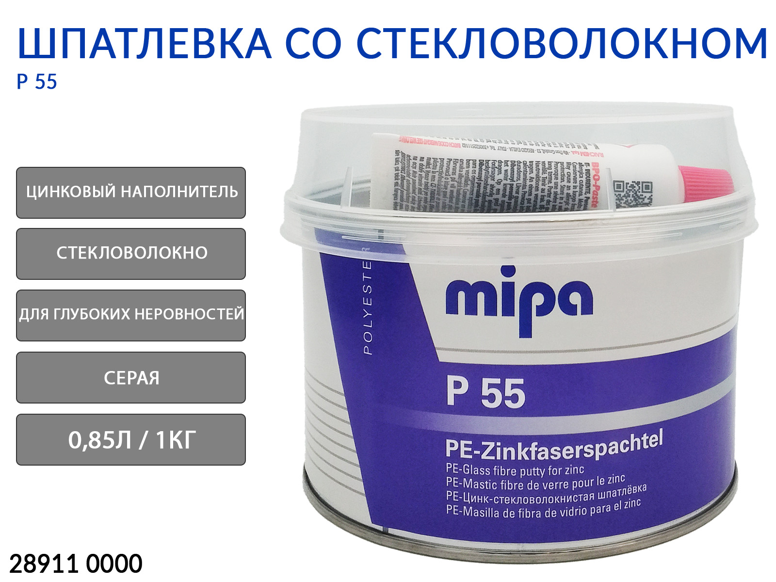 Шпатлевка со стекловолокном и с цинковым наполнителем P55 Mipa (289110000) - это поддающаяся шлифовке двухкомпонентная стекловолоконная шпатлевка на основе полиэфирной смолы, обладающая адгезией к железу и стали, цинку, алюминию, дереву и всем широко используемым в автомобильной промышленности пластмассам. Благодаря содержащемуся в нем стекловолокну, изделие особенно хорошо подходит для заполнения глубоких неровностей, небольших отверстий и перфораций, вызванных коррозией.