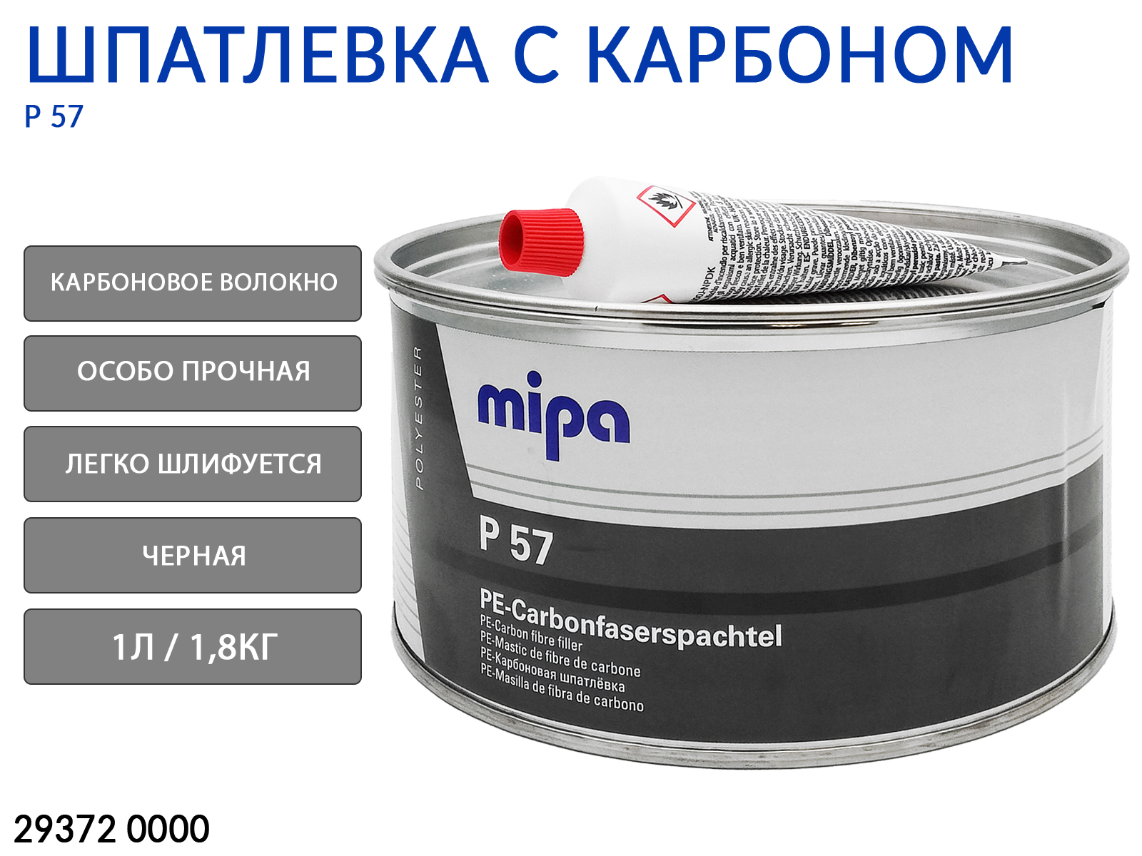Шпатлевка карбоновая P57 MIPA - это легкая в шлифовке, содержащая армированное карбоновое волокно, 2-компонентная стекловолоконная шпатлевка на основе полиэфирной смолы, обеспечивающая адгезию к железу и стали, а также к цинку, алюминию, армированному стеклопластику (GRP) и дереву. В отличие от общепринятых стекловолоконных шпатлевок, Mipa P 57 дополнительно содержит карбоновое волокно с высокой сопротивляемостью, обеспечивающее превосходную стойкость. Данное изделие идеально подходит для заполнения трещин, небольших отверстий и перфораций, вызванных коррозией, в авторемонтной отрасли.