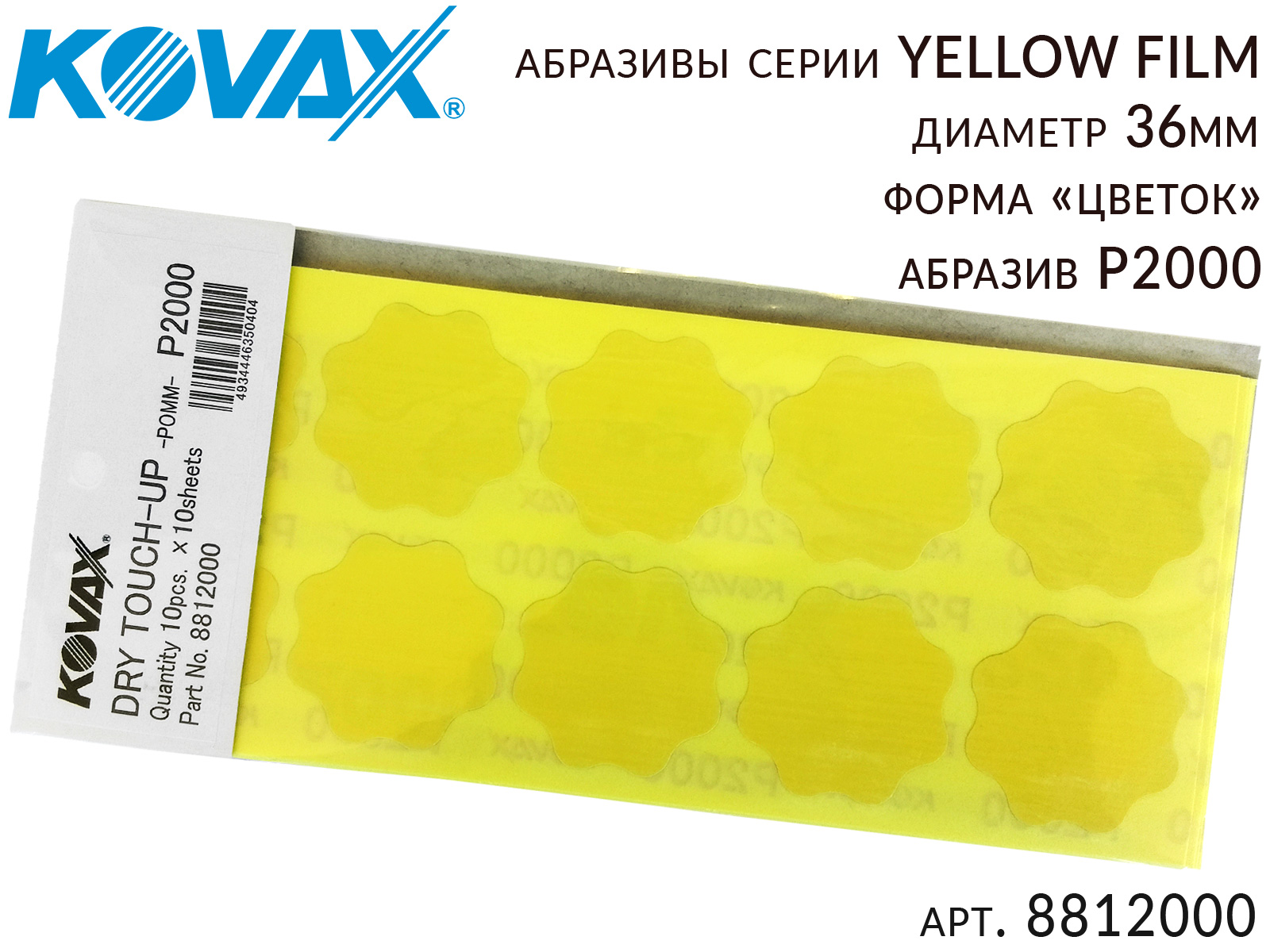 Круг абразивный "цветок" Р2000 36мм Yellow Film KOVAX 881-2000 на полимерной основе, предназначен для удаления дефектов окраски максимально быстро. Применение новой технологии нанесения и фиксации абразива позволило исключить вероятность возникновения царапин и более глубоких рисок на обрабатываемой поверхности. Рабочая поверхность микроабразивных кругов снаружи покрыта специальным защитным слоем, который защищает обрабатываемую поверхность от перегрева и предохраняет структуру абразива от деформации при транспортировке и хранении. Используется со специальным шлифблоком бочонок.