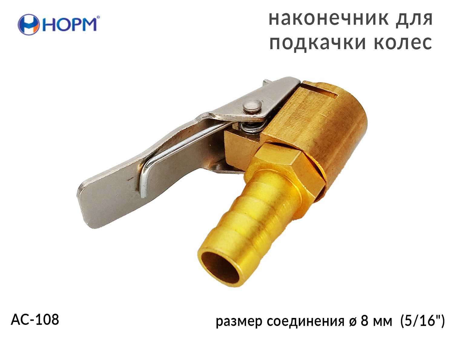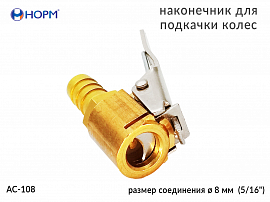 Наконечник для подкачки колес НОРМ (AC-108) устанавливается на конце воздушного шланга пистолета для подкачки колес, предназначен для жёсткой сцепки воздушного шланга и вентиля автомобильной покрышки. Переходник изготовлен из металла(латунь).