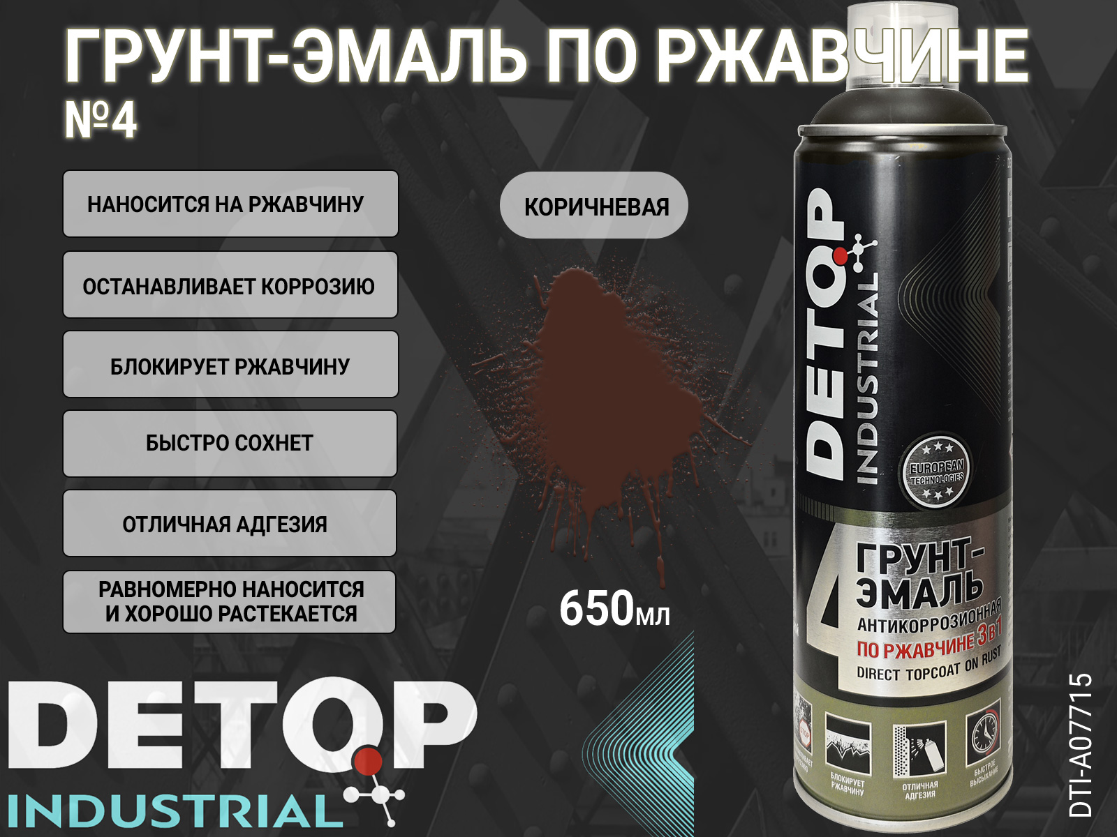 1. грунт-эмаль №4 по ржавчине коричневая RAL-8016 "3 в 1" INDUSTRIAL DETOP (аэрозоль, 650мл)1
