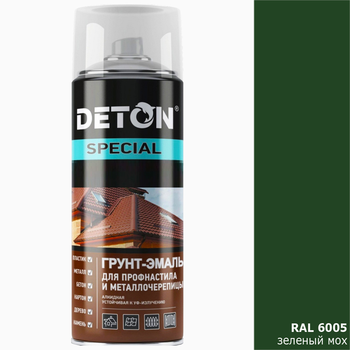 1. грунт-эмаль RAL 6005 зеленый мох для профнастила и металлочерепицы DETON (аэрозоль, 520мл) 1