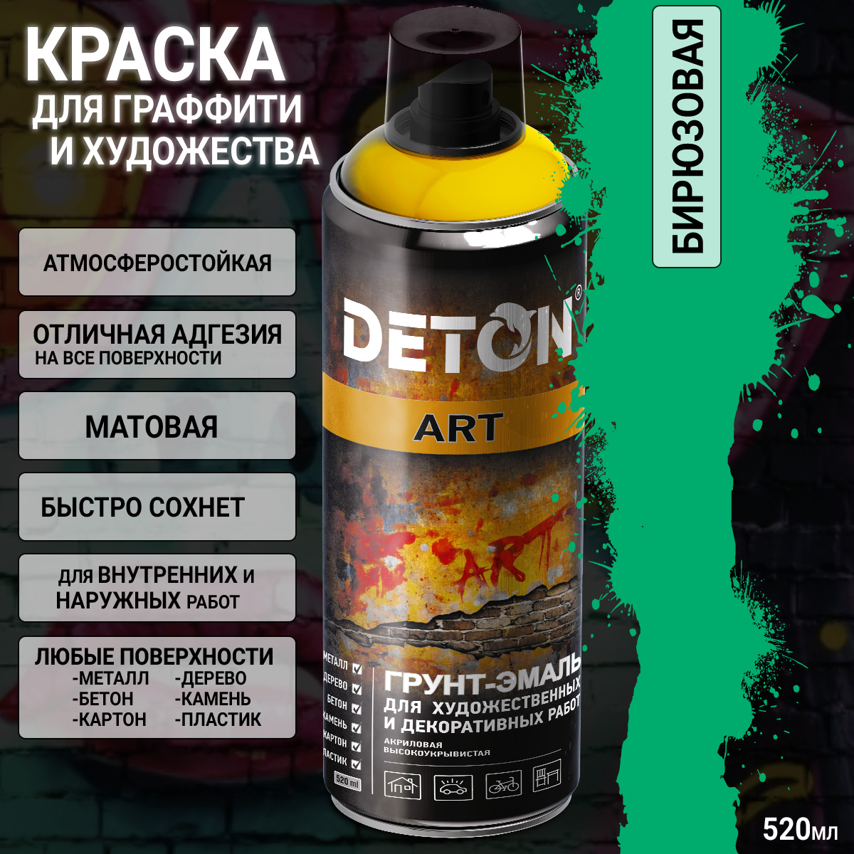 Краска для граффити и дизайна БИРЮЗОВАЯ универсальная DETON ART (аэрозоль, 520мл)