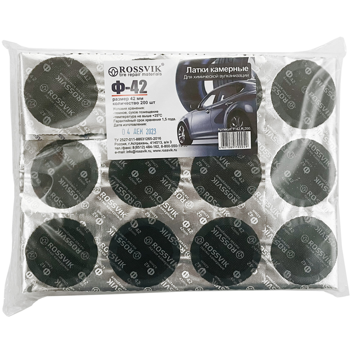 Двухслойная заплатка Ф-42 ROSSVIK применяется для ремонта пневматических камер любых размеров всех видов транспорта: велосипедов, мотоциклов, легковых и грузовых автомобилей, сельскохозяйственной техники.