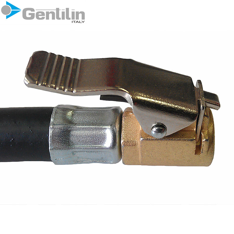 Пистолет для подкачки GUN1 GENTILIN (Италия), предназначенный для накачки автомобильных колёс, имеет фронтальное расположение манометра. При подключении через шланг к источнику сжатого воздуха готов к работе.