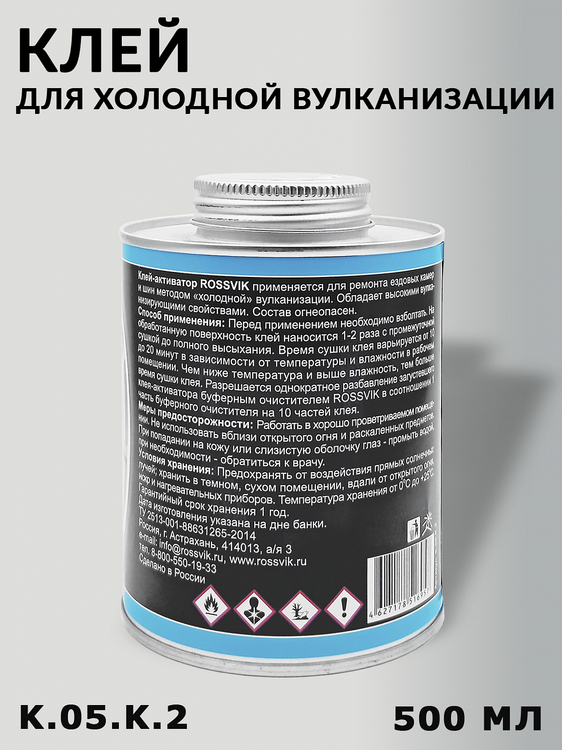 Клей для ХОЛОДНОЙ вулканизации ROSSVIK (K.05.K.2) – это универсальный клей-активатор, который эффективно применяется для восстановления повреждений с использованием латок, грибков, жгутов и кордовых пластырей методом "холодной" вулканизации.
