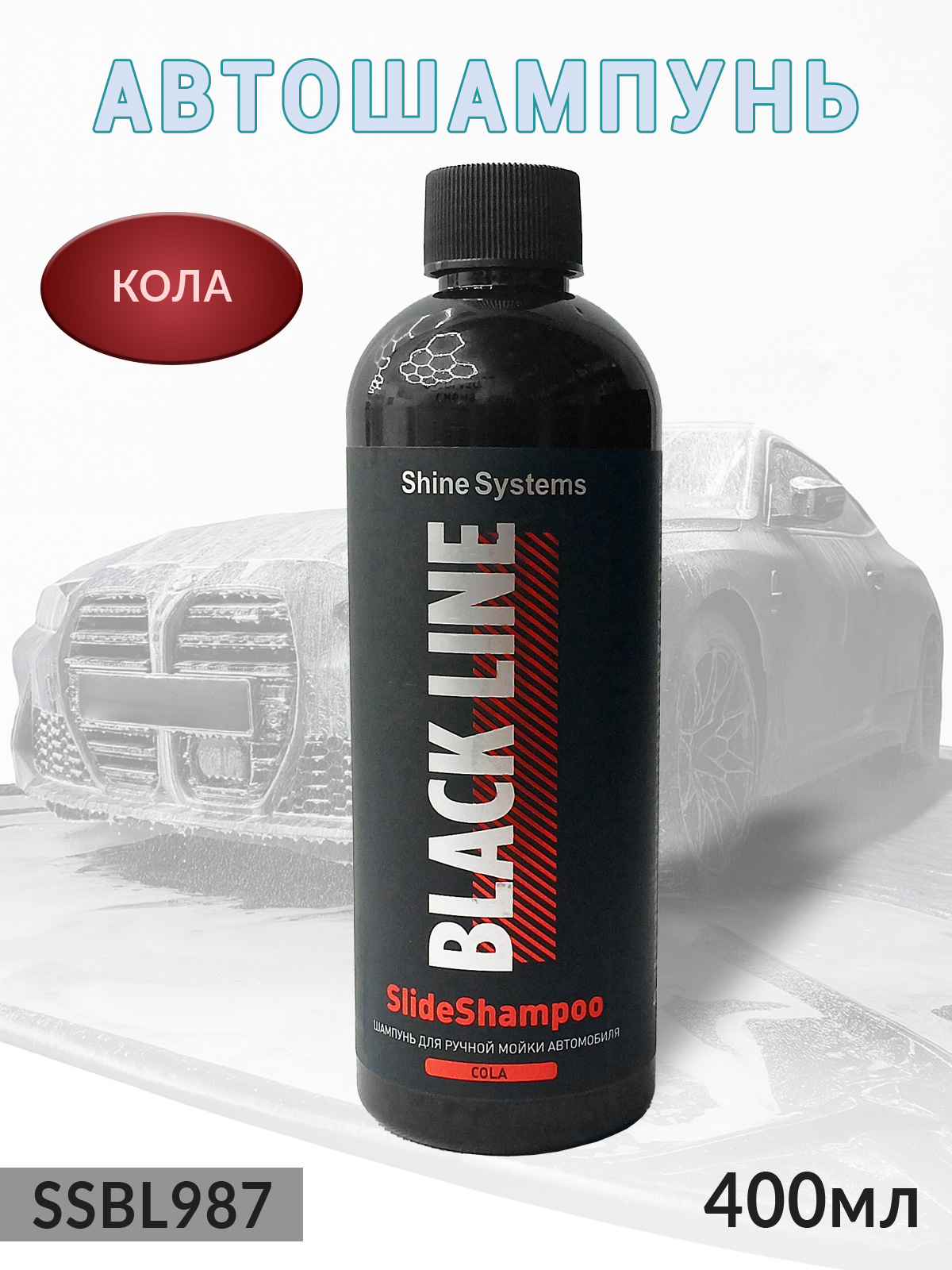 1. автошампунь для ручной мойки BLACK LINE SlideShampoo КОЛА деликатный SHINE SYSTEMS (400мл)1
