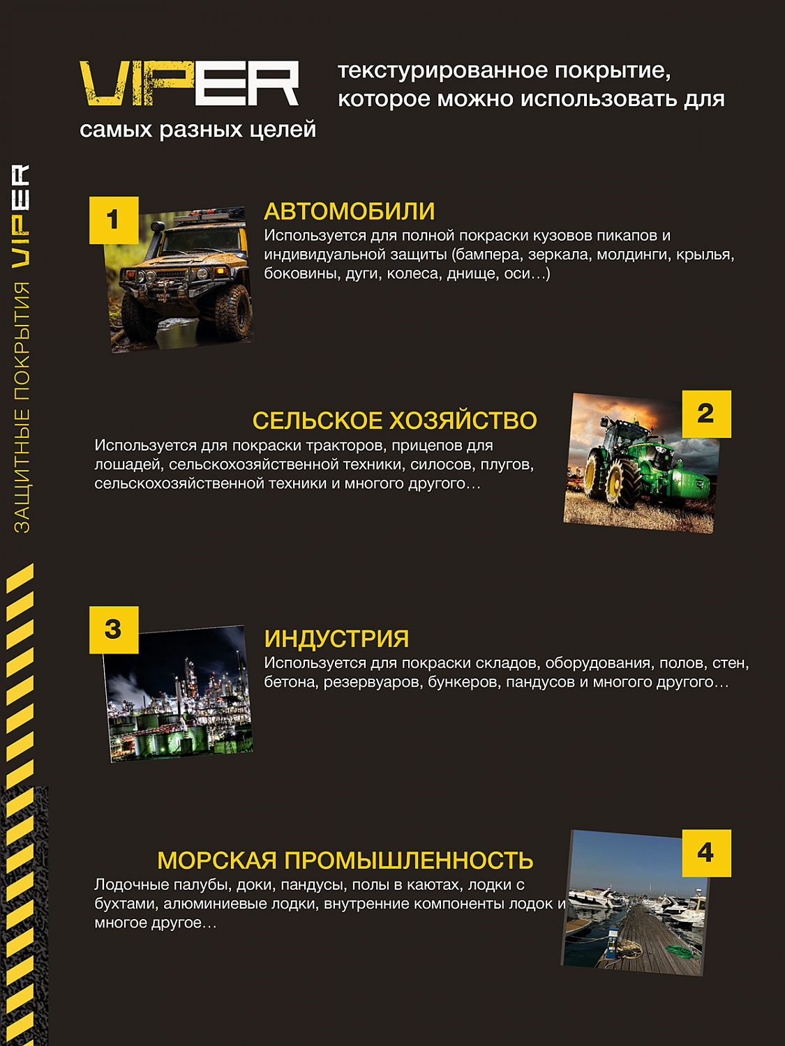 Защитное покрытие VIPER от AMAZONA PAINTS — сверхпрочное двухкомпонентное защитное покрытие премиум-класса, разработанное для максимальной защиты кузова автомобиля и любых других поверхностей, подвергающихся интенсивным нагрузкам.