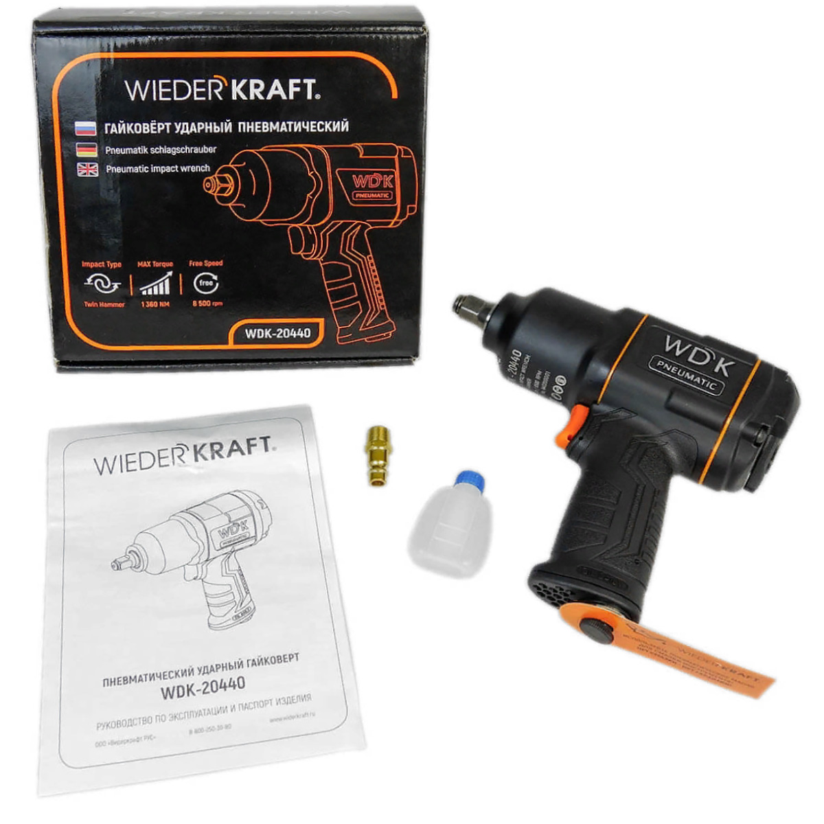 Пневматический ударный гайковерт WIEDERKRAFT (WDK-20440) с приводным квадратом 1/2″ предназначен для проведения монтажных/демонтажных работ с крепежом, работает от источника сжатого воздуха. Используется на СТО, производственных предприятиях, в сборочных цехах. Подходит для работы с жесткими (металл-металл) и мягкими (металл-прокладка-металл) соединениями.