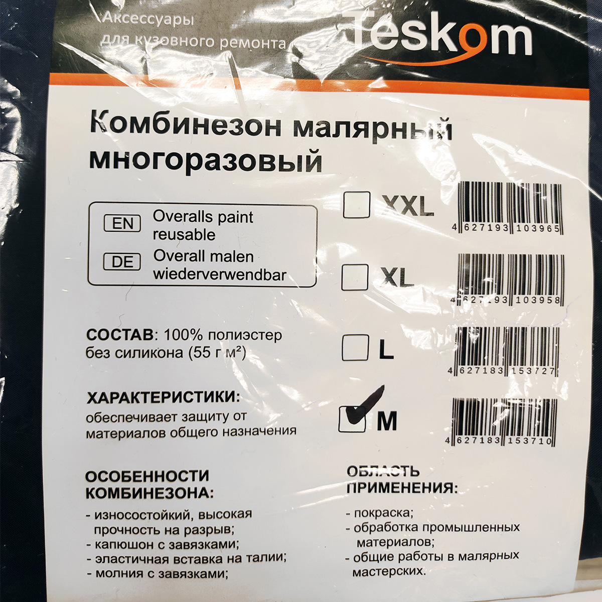 Многоразовый малярный комбинезон с капюшоном TESKOM используется в качестве защитной спецодежды при кузовных и покрасочных работах и т.п. Может использоваться при работе с красками и лаками, смазочными материалами, полиуретановой пеной.