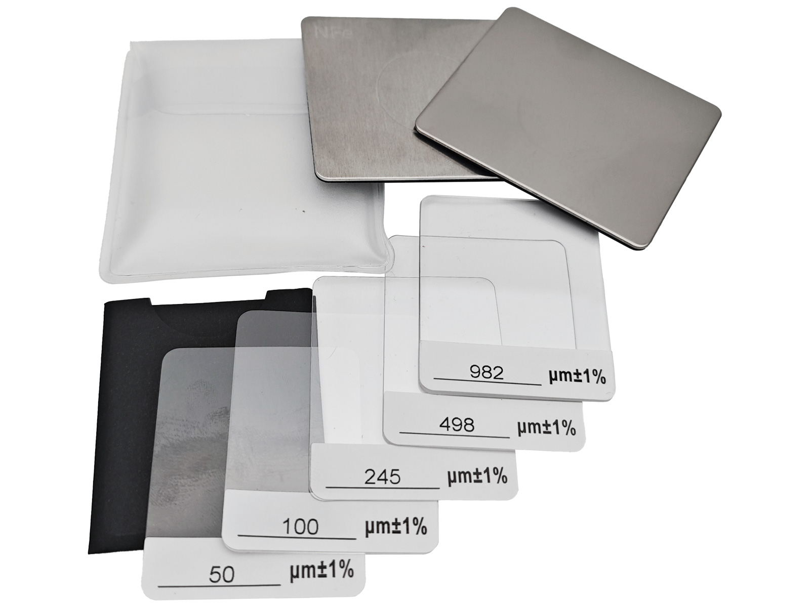 Набор для калибровки толщиномеров. В состав входит 2 металлических пластины на мягкой основе (металл/алюминий) и калибровочные пластины 50/100/245/498/982мкм.