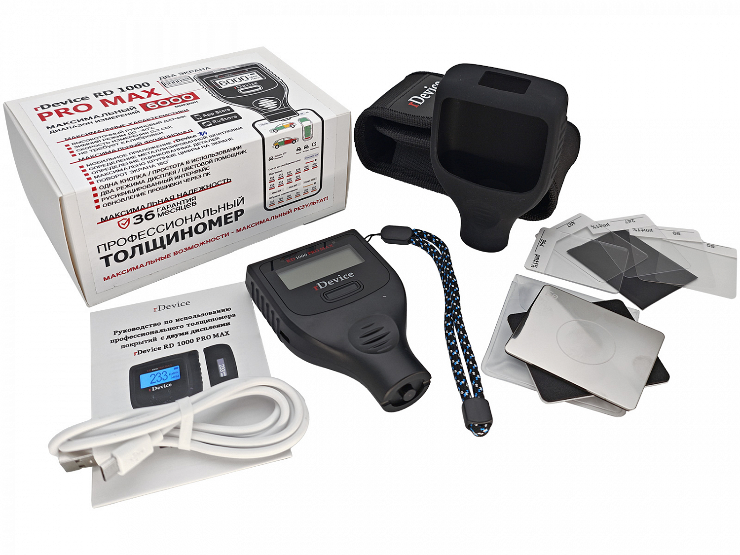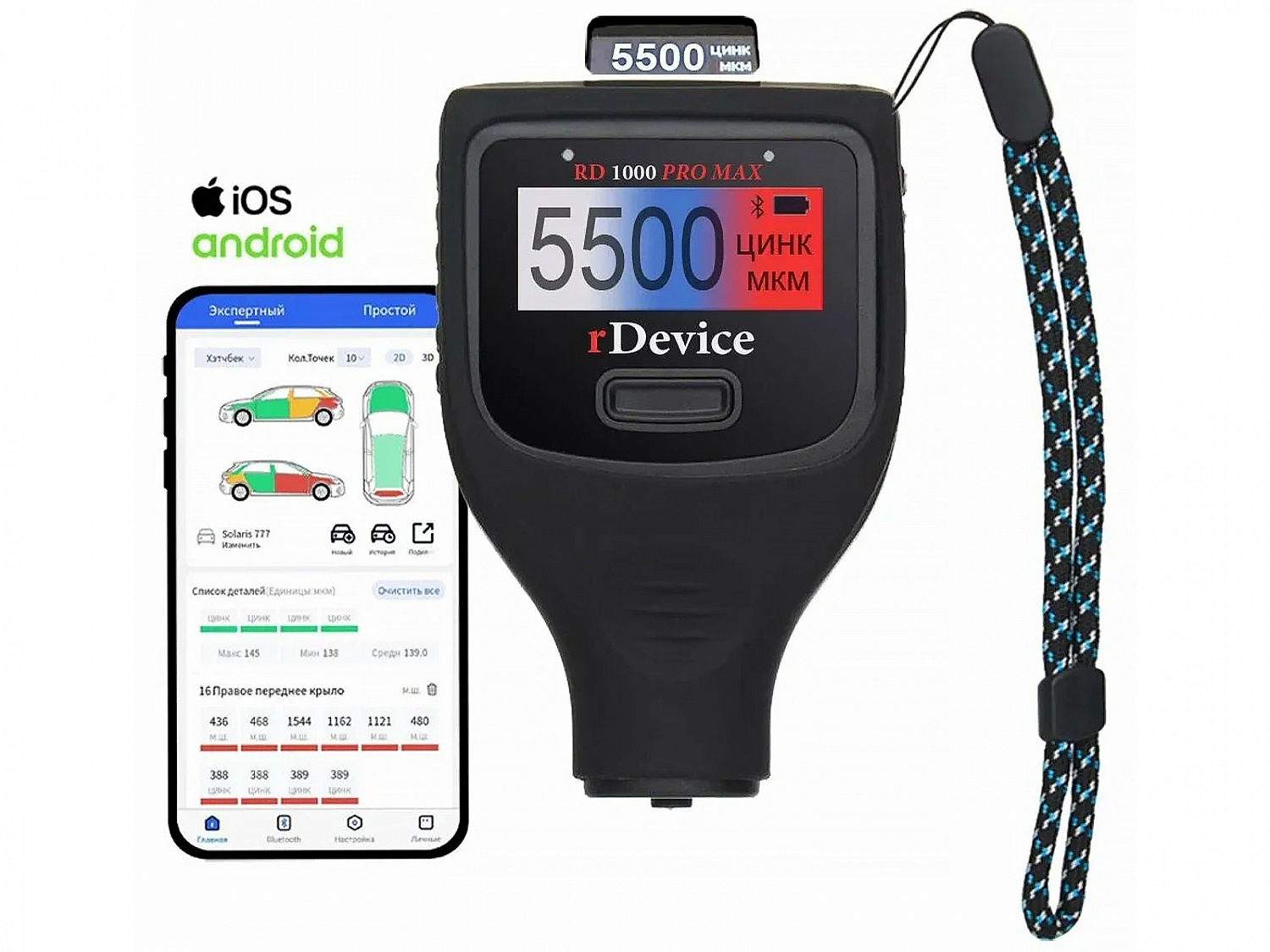Профессиональный толщиномер RD-1000 PRO MAX rDevice - прибор для профессионального автоподбора, диапазон измерений от 0 до 6000 микрон, первый в мире толщиномер с двумя экранами, максимально возможный функционал объединенный в одном приборе максимальная надежность (расширенная гарантия 36 месяцев). Без проблем определит, если для восстановления авто использовалась металлизированная шпатлевка, проверит оцинкована деталь или нет (заменена на китайский аналог). Для определения толщины используется самый точный и дорогой, рубиновый (нестираемый датчик), с максимальным диапазоном работы до 6000 микрон и молниеносной скоростью измерений. Удобная, форма, отлично зарекомендовавшая себя при использовании в профессиональном авто подборе и простота в использовании (1 кнопка, инструкцией можно не пользоваться). Функция Bluetooth для работы с приложением по созданию АВТО ОТЧЕТОВ, плюс поддержка коммерческих приложений использующихся в трейдине (актуально для автосалонов). Толщиномер rDevice RD-1000 PRO MAX объединил в себе максимально возможный набор имеющихся на рынке опций, максимальные характеристики и комплектацию, простоту в использовании, максимальную надежность. В данный момент является самой передовой моделью.